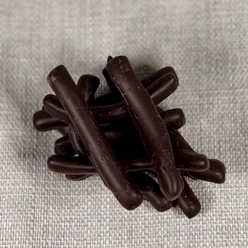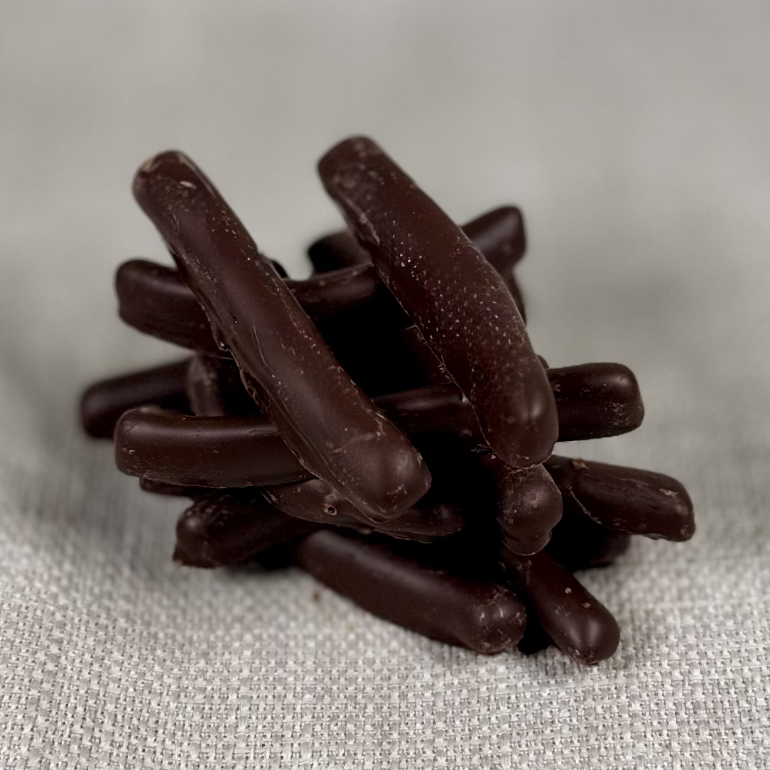 Kandierte Zitronenschalen, getaucht in Zartbitter Schokolade.