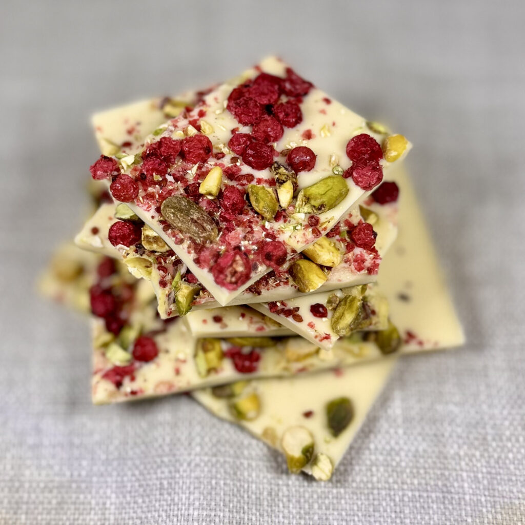 frische fruchtig, süß säuerliche Johannisbeeren in Kombination mit der feinen Pistazie und der cremigen weißen Schokolade.