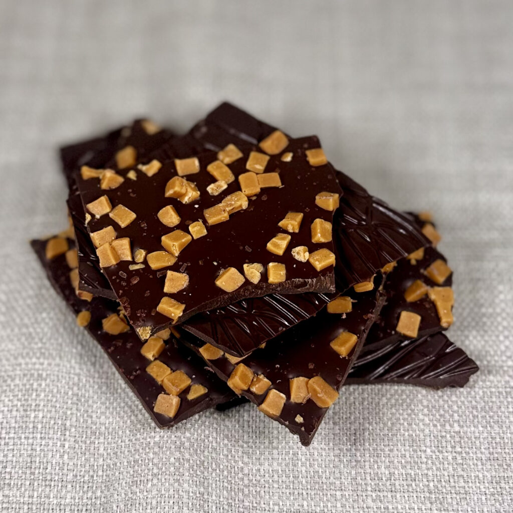 Fein bittere dunkle Zartbitterschokolade mit Toffee und einer Prise Meersalz.