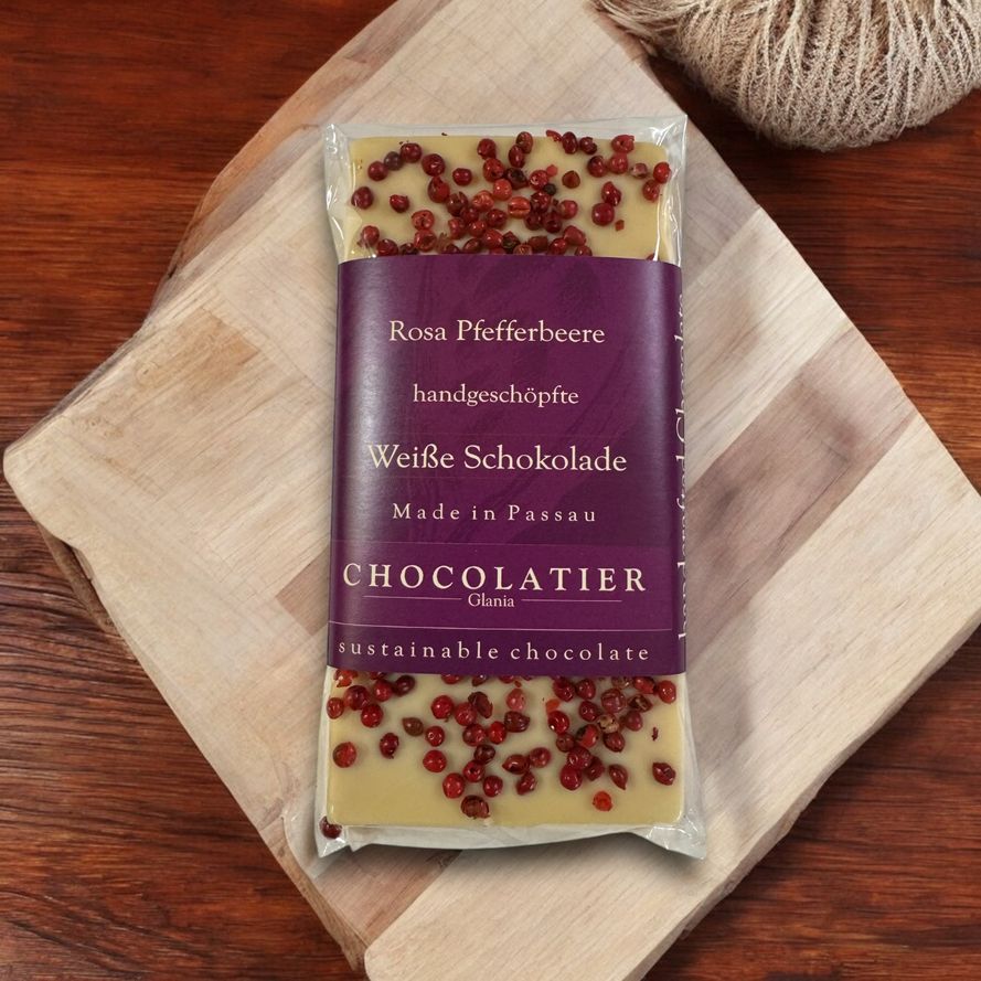 Eine cremig vanillige weiße Tafelschokolade, kominiert mit der fruchtig, pfeffrigen leicht würzigen Rosa Pfefferbeere.